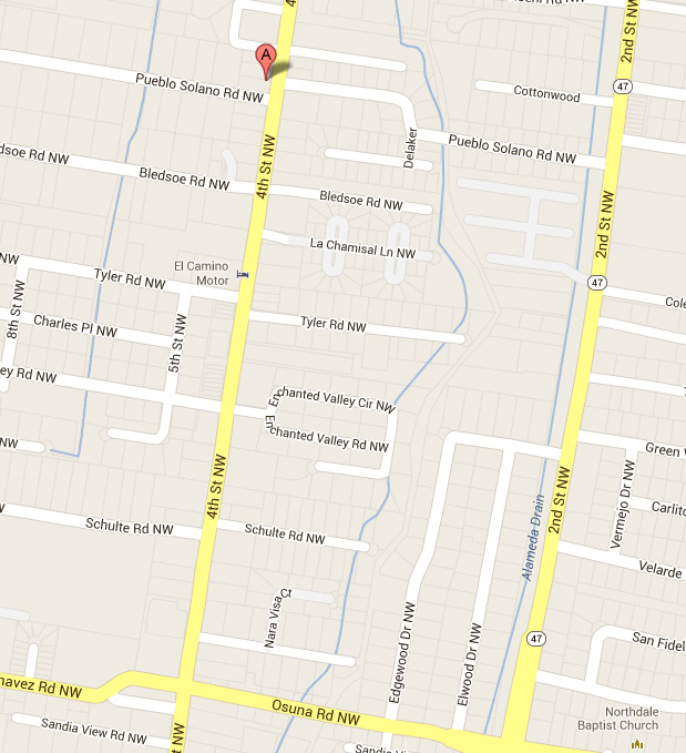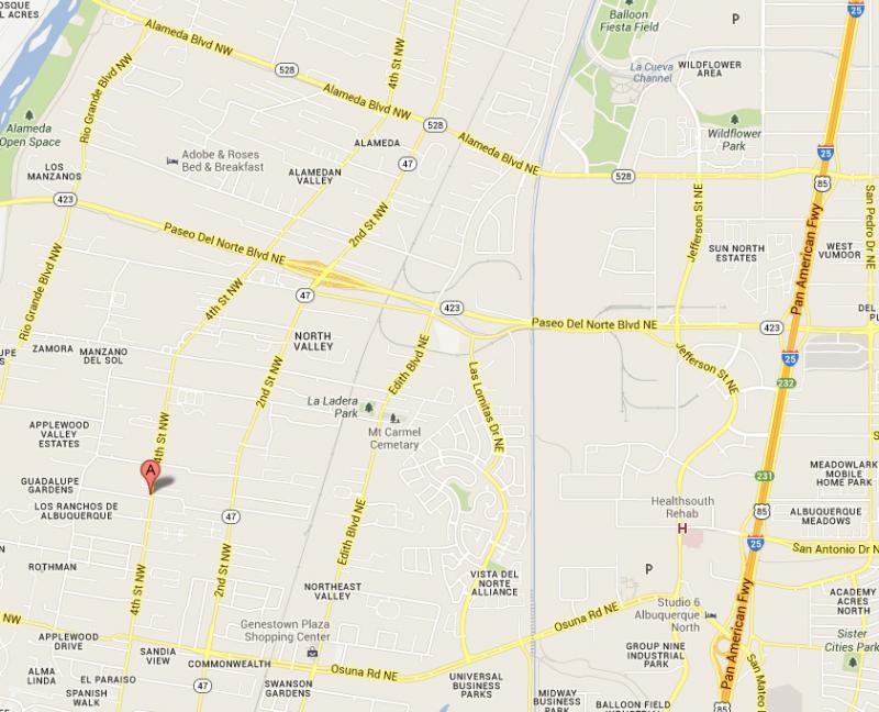 From downtown Albuquerque: Head north on 4th Street, continuing past Osuna approximately half a mile. We are just north of Dan's Boots and Saddles - the next left, Pueblo Solano - in the sweet adobe with the linens on the line out front.